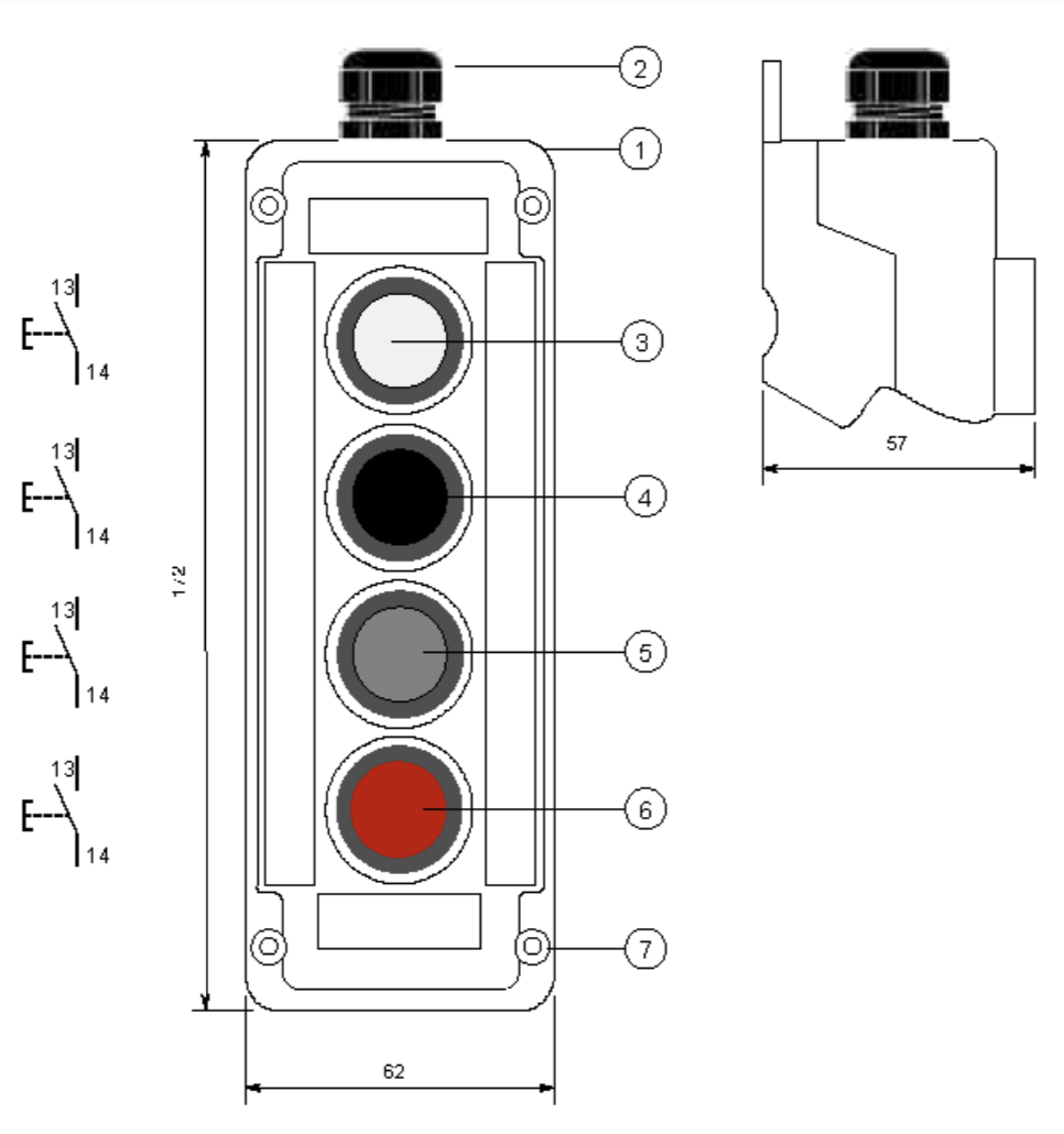 YSI1691 er en meget robust og driftsikker kontrolboks, som har fire trykknapper med en NO kontakt. Kontrolboksen anvendes typisk med kraner, hydraulik og diverse applikationer.